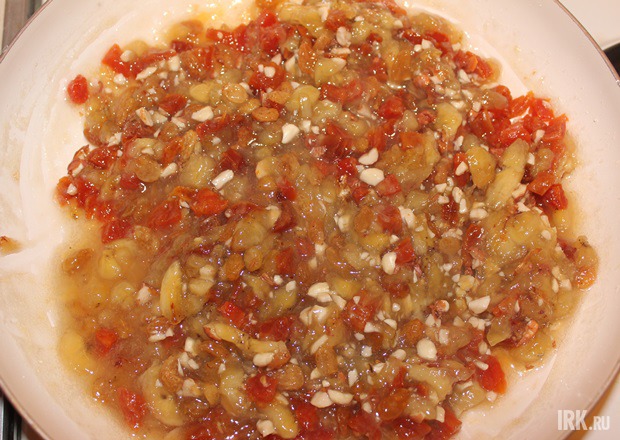 3. Пока бананы тушатся, мелко нарезаем курагу и измельчаем орехи. Изюм замачиваем в теплой воде. Через 40 минут в банановую массу добавляем орехи, курагу и изюм.
