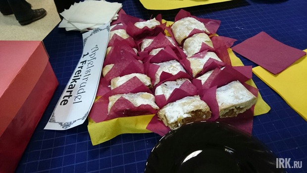 Разобрались. Ребята хорошо подготовились. На входе встречает девушка в традиционном немецком костюме и предлагает приобрести фрайкарту за 50 рублей. По этой карте можно купить четыре блюда.