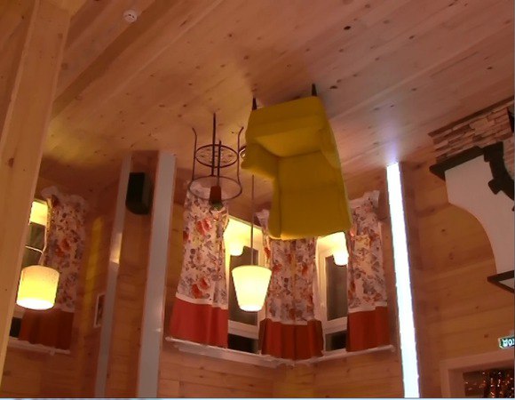 В кафе 2 отдельных помещения. Первое — суровый паб, оформленный в урбанистическом стиле. Второе — банкетный зал, обставленный как добротный уютный дом: камин, креслица, занавески.