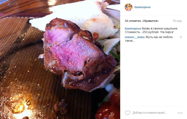 Следом, на четырнадцатом месте, пусть будет явно пережаренное мясо прожарки medium rare* из ресторана «Мамини».