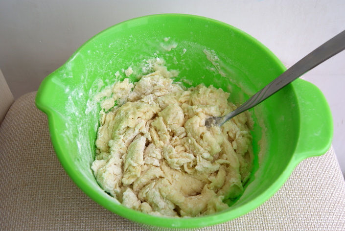 5. Быстро замешиваем гладкое и пластичное тесто. При необходимости досыпаем муки до нужной консистенции. Накрываем тесто пленкой и убираем в холодильник примерно на час.
