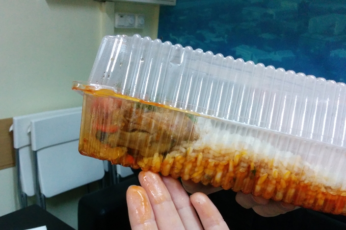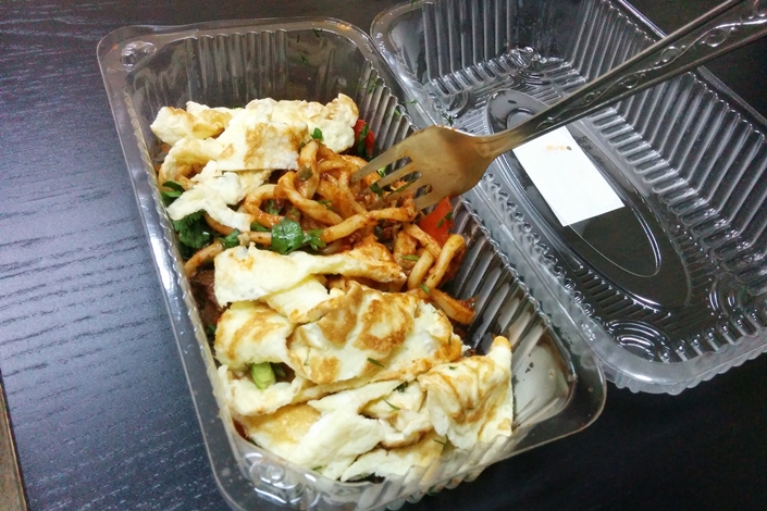 Курьер объяснил, что раньше повара помещали все блюда в герметичные контейнеры, но потом некоторые кушанья (видимо, из экономии) стали складывать в обычные упаковки, как от тортиков-полосок. И предложил заменить заказ и привезти через час новый. Но столько времени мы были ждать не согласны, тем более что ситуация при ближайшем рассмотрении оказалась не такой катастрофичной. Вместе с курьером положили контейнеры в обычный пластиковый пакет и рассчитались (у нас было «без сдачи»).