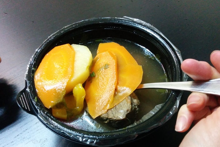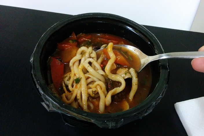 В шурпе, открыв упаковку, мы обнаружили меньше зелени, чем было изображено на фотографии на сайте. Однако эта мелочь при первом впечатлении померкла на фоне размеров куска мяса, положенного в суп. Оно занимало почти весь небольшой контейнер, при этом было нежирное, в достаточной мере проваренное. Одно «но». И по виду, и по вкусу показалось, что это не баранина, а говядина. Хотя в меню было заявлено, что шурпа — это ароматный бульон с корейкой ягненка.