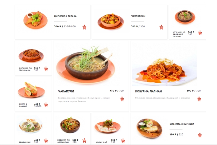 Меню у «Кинзы» достаточно разнообразное, есть навигация по разделам, кавказская кухня представлена широко. Фотографии блюд, на наш вкус, маленькие, хотелось бы чуть покрупнее. Но в целом всё выглядит аппетитно.