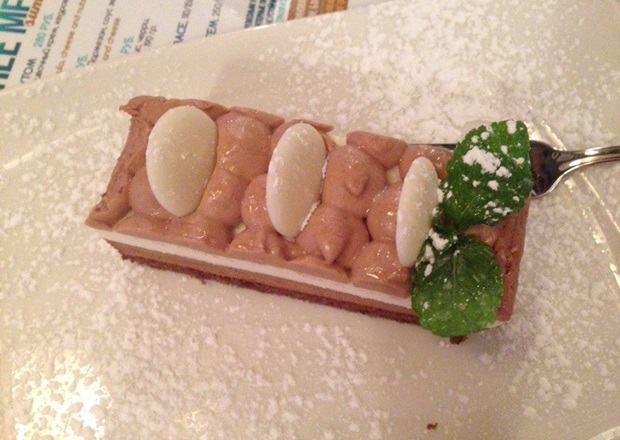 Казалось бы, что может быть прекраснее трех муссов из разных видов шоколада: белого, молочного и тёмного… Но единственное, что уловили мои вкусовые рецепторы, — это сладость сахарной пудры, которой посыпали десерт. Сам тортик был абсолютно безвкусен. Можете себе представить: слой белого и молочного шоколада, закрыв глаза, невозможно было отличить ни по вкусу, ни по консистенции. Они были одинаково резиновыми — повар явно переборщил с желатином. А горький шоколад в этом трио выступал в роли бисквита. Единственный слой, который как-то пытался спасти десерт. Но его невнятного вкуса не хватило, чтобы я поставил оценку выше 2. Еще был крем-украшение сверху, он имел неприятный жирный маслянистый блеск, а заботливо воткнутые в крем пластинки белого шоколада переморозили.