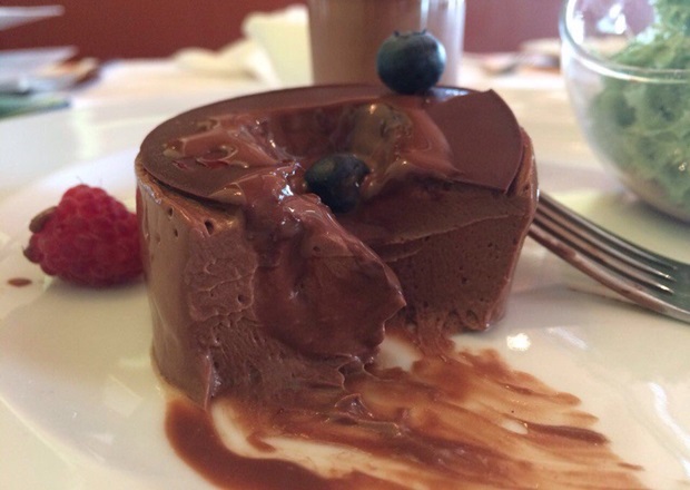 Мусс с малиной и голубикой из темного шоколада (Танзания). Воздушный мусс с пластинкой шоколада при подаче полили горячим шоколадным соусом. Если предыдущий десерт был нежным, то этот отличался более терпким вкусом. Насыщенный, концентрированный вкус и ничего лишнего. Строгий, изысканный десерт для гурманов.