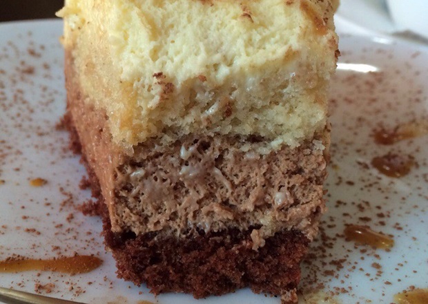 Десерт из крема на основе маскарпоне и двух видов шоколада — белого и молочного. Вкусный, сладкий торт. Но он ничем не удивил: обычный десерт к чашке кофе. Взбитый воздушный крем, с приличной порцией сахара, сливочный. Бисквит влажный, хорошо пропитанный и мягкий. Общее впечатление подпортил внешний вид десерта: неаккуратно отрезанный кусок и странные неаппетитные капли в качестве украшения.