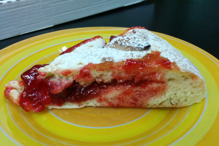 Вишню — тут мы и не ожидали ничего сверхординарного — повар использовал консервированную. В джеме чувствовался крахмал. Тесто было мягким, явно свежим, приятным на вкус. Но огорчало то, что в нем попадались осколки яичной скорлупы.