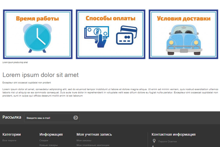 В самом низу главной страницы мы вновь (как и в другом заведении кавказской кухни) встретили выражение на латыни: неподчищенные следы верстки сайта по шаблону. Однако порадовало наличие там же веселых иконок, сулящих информацию о времени работы заведения, условиях доставки и способах оплаты.