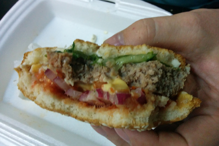 Мы не могли обойти стороной новое гриль-меню. Бургер пробовал мужчина. Скажем сразу: не наелся. Однако, по его оценке, мясо было свежее, плотное, не «картонное», как это часто бывает в других заведениях (рекомендуем почитать большой обзор на эту тему). Минус: многовато красного лука, не очень свежая булочка.