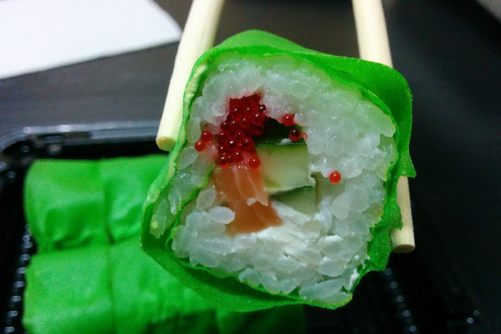 Роллы не соответствовали картинке на сайте. Оранжевый цвет соевой бумаги, как на фото, делал блюдо более аппетитным на вид, чем ядрено-зеленый.