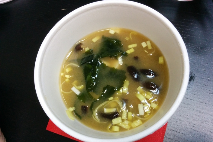 Плюсы: мисо мы застали еще горячим. Бульон был ароматным, в меру соленым. Шиитаке придавали ему приятный грибной вкус.