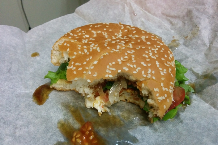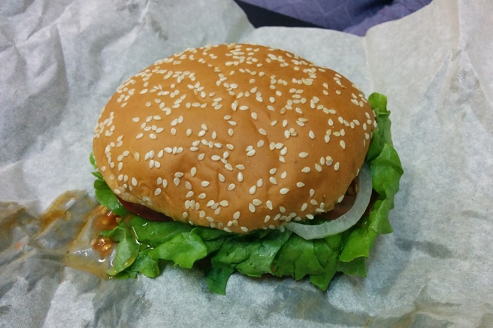 А вот и новинка меню. К бургеру не прилагалась картошка фри, хотя это легко объяснить невысокой стоимостью. Булочка, салат, овощи были свежими. Мяса положили немного, его сложно было найти и никак не удавалось запечатлеть на фото. Больше всего вкуса блюду придавал соус барбекю. Отметили, что очень много вытекло жидкости из помидоров: запачкавшейся была упаковка и впоследствии сам дегустирующий.