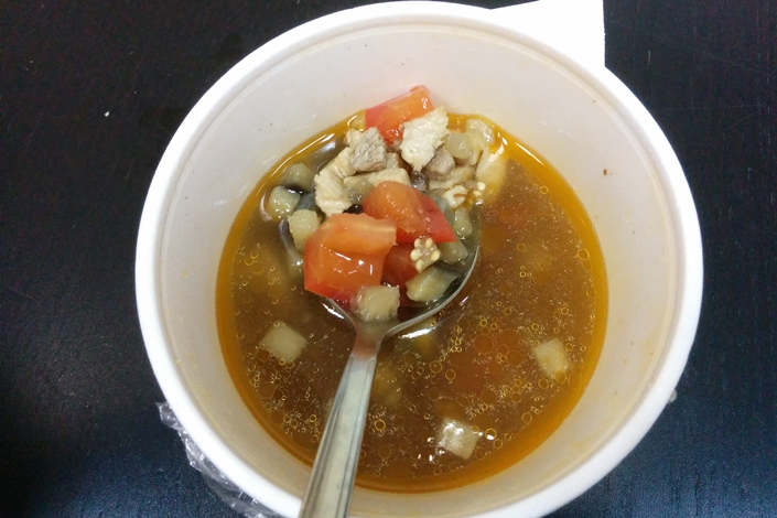 Острый суп с куриной грудкой, свининой, томатами, баклажанами и луком дегустирующему пришелся по душе. Блюдо было теплым, что усиливало вкус, при этом перченым в меру. Понравилась мелкая нарезка ингредиентов, мясо без жира и жилок. «C удовольствием его съела», — подытожила коллега.