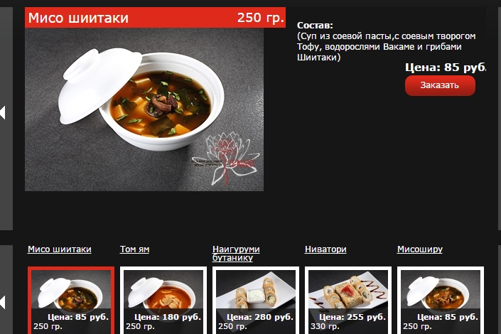 Сайт заведения, как и у одной из недавно протестированных доставок японской еды, выполнен в черно-красной цветовой гамме. Долго смотреть на такое тяжело для глаз, поэтому хочется поскорее сделать выбор и закрыть страничку. Но надо признать, сверстана она достаточно удобно и просто, сразу можно просматривать разделы меню на главной.