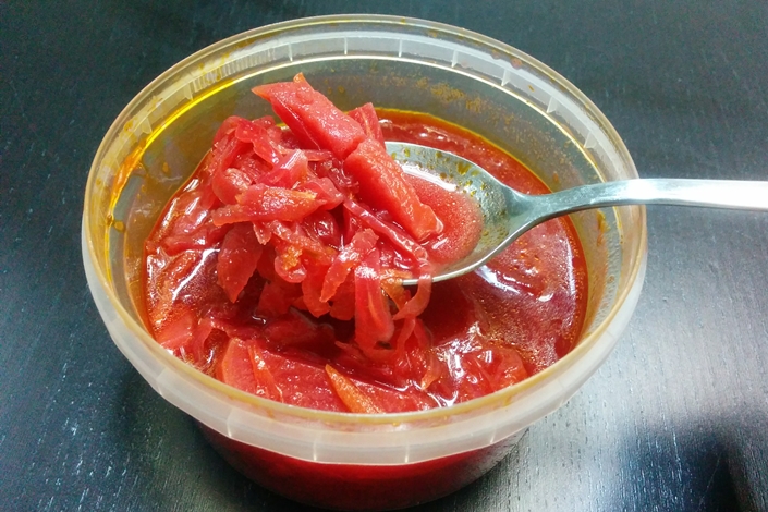 Салат понравился гораздо меньше, чем борщ. Оно и понятно: где взять свежие и вкусные овощи в Сибири зимой? Правильно — не в Сибири. В салате мы нашли китайские огурцы, помидоры и болгарский перец. Заявленной изначально Иваном красной капусты не было. Возможно, её он тоже съел.