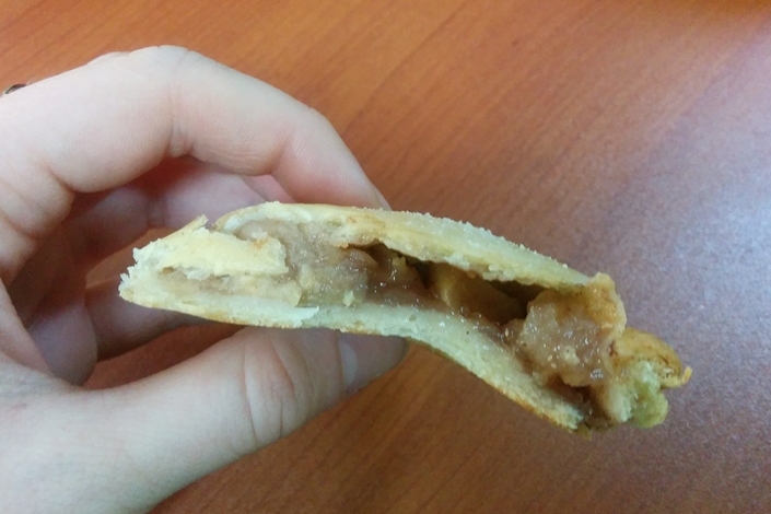 Пирожки с яблоком и корицей сделаны с использованием пресного теста из воды и муки. Сверху слегка присыпаны сахарной пудрой. Структура — плотная, ничего не разваливается. Просто съедобно. «Четыре».