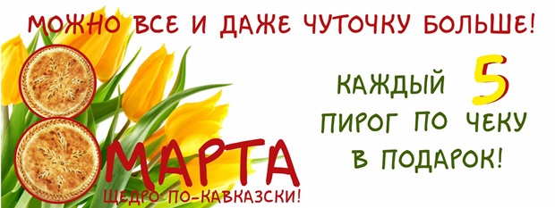«8 марта щедро по-кавказски» – акция к Международному женскому дню. «Лю-ля» отдаёт в подарок каждый пятый пирог по чеку*.