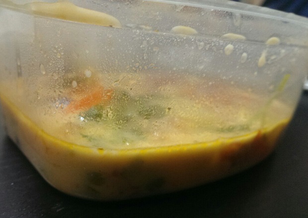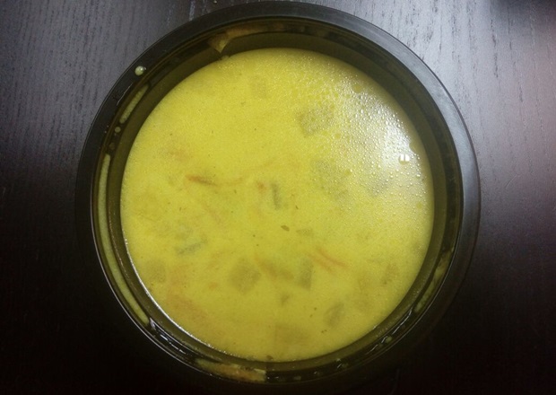 Мне повезло больше, чем одной из моих коллег — суп плотно закрыли, он не разлился. Порция оказалась достаточно большой, а сам суп сытным и густым. Общее впечатление подпортило то, что он был еле тёплым. В ярко-желтом бульоне плавали кусочки картошки, кабачка, горох, сыр Тофу, морковь, петрушка. Поскольку я не знаток индийских специй, сложно сказать, что было добавлено в суп ещё. Он не показался мне жирным и был в меру солёным. На мой вкус, с петрушкой переборщили. Я не очень её люблю, петрушка была жестковатой и какой-то жёлтой — видимо, не особо свежей. В целом суп неплох.