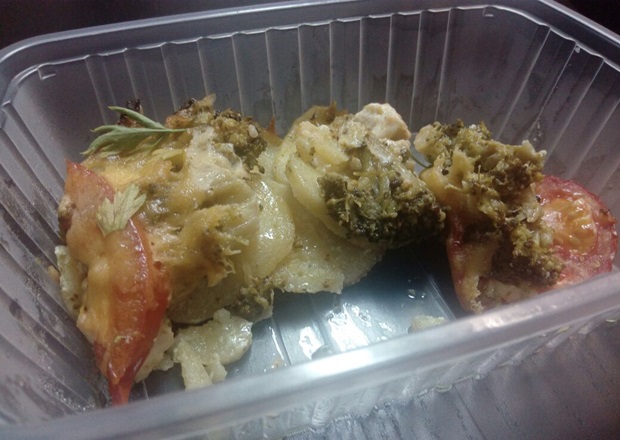 Картофельная запеканка оказалась остывшей. И сверху её обильно украсили листьями петрушки, что, как и в предыдущем блюде, мало радовало. Причём листья были полусухие и желтые. Может, это уже осенний дизайн? Я как-то не ожидала, что в картофельной запеканке будет столько брокколи. Причём выглядела она не очень аппетитно. Была серо-зеленого и коричневого цвета, то ли переваренная, то ли подгоревшая во время обжаривания. Сыр придавал всему блюду кисловатый вкус. Помидоры, которыми украсили запеканку сверху, были жестковатыми. На столе в этот момент стояли домашние помидоры (коллега угощала), так вот, у них было явное преимущество перед этими, резиновыми. Если резюмировать: остывшая запеканка с унылыми броколли и петрушкой, пережившей осень, — это не предел моих мечтаний.