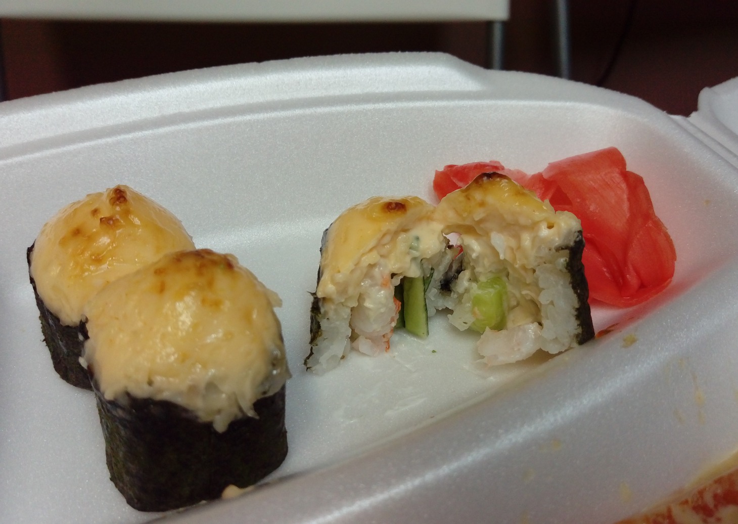 Роллы, видимо, делали из обрезков лосося, которые остаются после обычной «Филадельфии», а соевый соус развели водой. Это, кстати, заметили все коллеги. В общем, мой ланч на тройку. Больше там заказывать я бы не стал, да и друзьям бы не посоветовал.