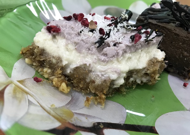 Удивилась, когда, попробовав десерт, я почувствовала, что на зубах захрустел лед. Белая прослойка была напрочь заморожена, несмотря на то что я приступила к еде не сразу после доставки — моё пирожное стояло минут 10-15. Дала десерту ещё немного времени, но это его, конечно, не спасло. Из-за этого льда (считай, воды) вкус стал кошмарным — несладким, разбавленным, никаким. Единственное, что в нём понравилось, это основа из сухофруктов и орехов. Больше ничего. Оценка 2. Никогда бы не стала больше пробовать.
