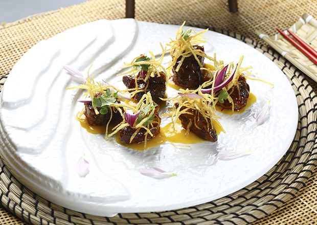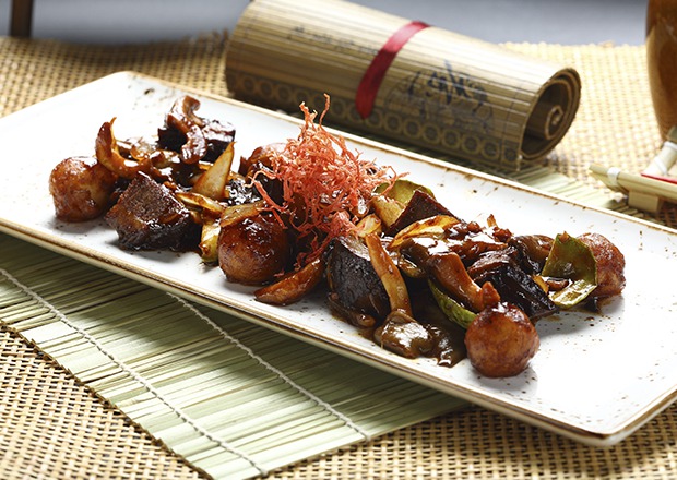 — кусочки баклажанов с овощами, олениной и креветочным соусом — 390 рублей;