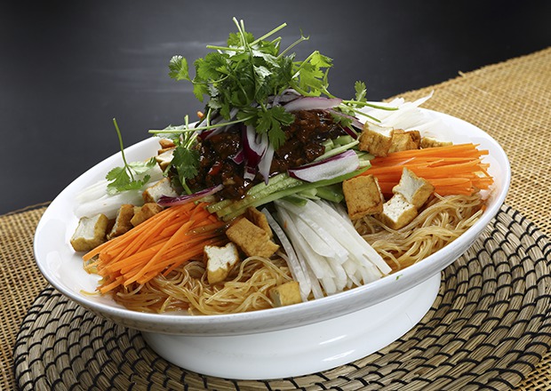 — салат из свежих овощей, соевой лепешки и жареной пряной лосятины — 530 рублей;