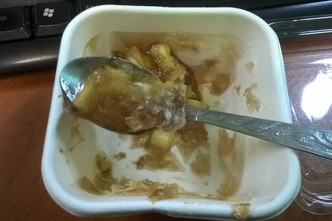 Комплиментом к доставке привезли банановое желе — контейнер тоже крепкий, но крышка еле держалась, всё время слетала. Ничего особенного про десерт сказать не могу. Банан мелкими кубиками в безвкусном желе — что с него взять? Сюрприз прятался на дне. Глядя в экран телефона, я понемногу ковырялась в десерте и в какой-то момент почувствовала на зубах что-то не похожее ни на желе, ни на банан. Ага, это упаковка. Вспомнилось описание экоупаковки на сайте: «Теоретически её можно есть». Практически, ребята, это не вкусно.