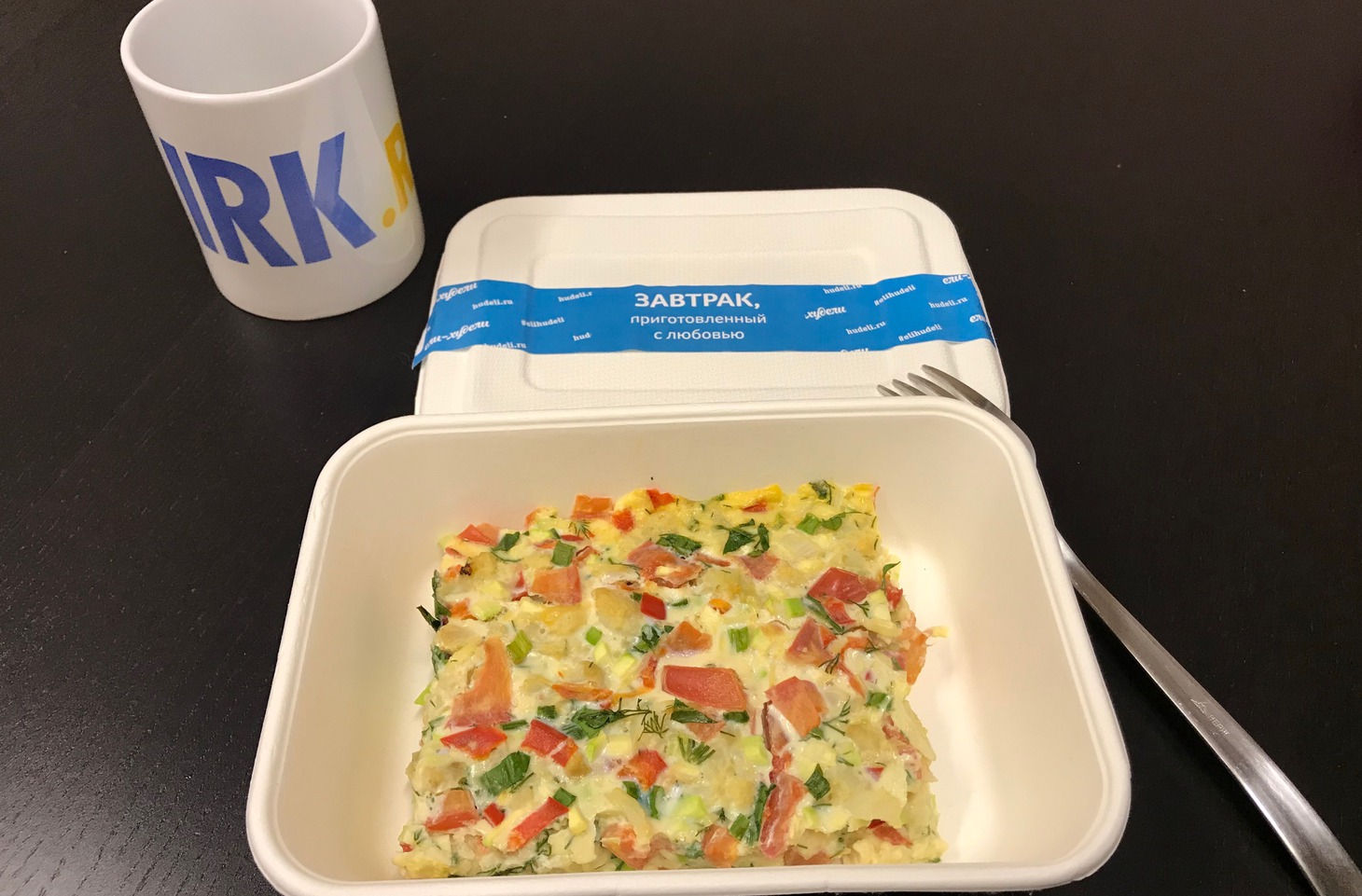 На завтрак обещали яичные кексы, вполне симпатичные и очень аппетитные на фотографии. То, что привезли, как видите, отличается. В контейнере с надписью «Завтрак, приготовленный с любовью» обнаружили нечто, напоминающее кусок фриттаты, или попросту омлета с овощами. Я распознала в нём помидоры, болгарский перец, цветную капусту, кажется, кабачок, укроп и зелёный лук. Капуста хрустела на зубах — вариант на любителя. Ещё, на мой вкус, пресновато, не хватало соли. Оно и понятно — еда рассчитана на приверженцев ЗОЖ. Но такой порцией с утра меня не накормишь. Совсем.