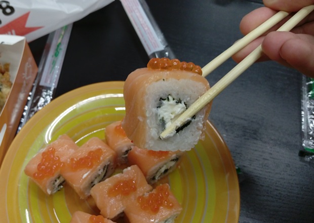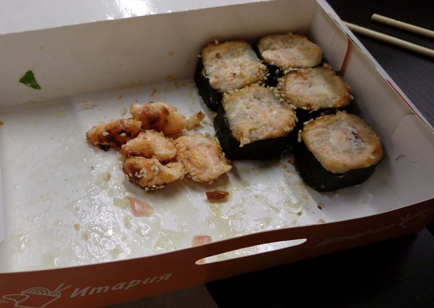 Очень хотелось поесть японской кухни, поэтому ожидала от новой доставки многого. В мой бизнес-ланч входили мисо-суп, салат «Цезарь», ролл «Киото». Удивила картонная коробочка, в которой доставили суп. Однако он оказался горячим и вкусным. В салате разочаровало все, кроме кусочков курицы в панировке — это было вкусно и необычно для «Цезаря». Остальное — листья салата, помидоры — было пресным, а сухарики — размякшими до кашицы. На дне оказался какой-то соус, но он совсем не чувствовался. Роллы сразу показались мне какими-то нестандартно большими. Но если этот факт можно отнести к плюсам, то простить «шапки» из майонеза невозможно. На сайте роллы выглядели куда аппетитнее, и «шапки» я приняла за сыр. Съев два кусочка, не смогла больше терпеть майонез и просто отодвинула его ложкой в сторону. Но жирный привкус ощущался еще очень долго. Лучше бы я закончила трапезу мисо-супом.