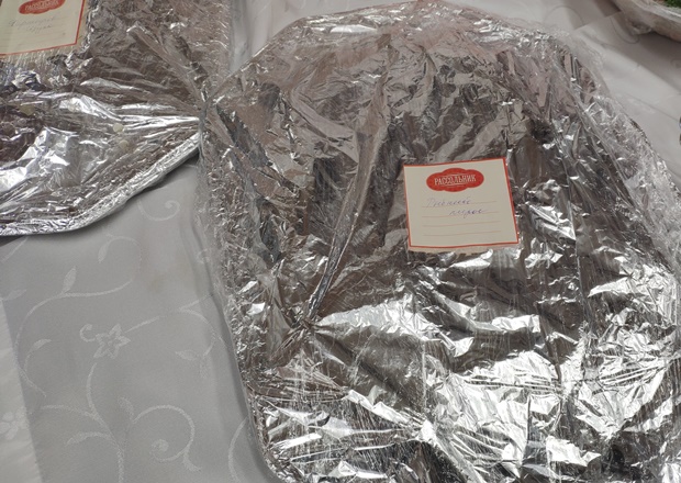 Договорились с оператором, что еда приедет к нам в 14:30. Курьер стоял на пороге офиса уже в 14:20. Попрощавшись с представителем ресторана, разглядели наш заказ. Тут же отметили герметичность упаковки: каждое блюдо плотно обернули фольгой и пищевой пленкой, заботливо подписав. Освободили ужин от обертки, расставили кушанья и дружно заключили, что угощение выглядит очень по-домашнему — мы даже не ожидали. Многие, пока не рассмотрели ближе, не догадались, что подносы и салатницы из пластмассы: «Стекло? Металл? Нам нужно будет мыть и им отвозить, что ли?». Не нужно, посуда одноразовая, просто выглядит достойно, так, что не стыдно поставить на праздничный стол.