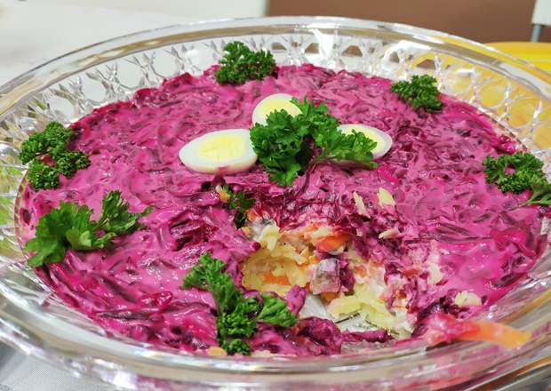Тоже классика. Приятный, тающий во рту салатик с хорошо протертыми ингредиентами, аккуратно выложенными слоями. Тот самый, который так любят за розовый майонез и идеальный баланс вкуса: сладковатый от свеклы, соленый от селедки. Порадовало, что рыбу хорошо обработали — нам не попалось ни единой косточки. Кто-то посетовал, что не хватает еще тертого яблока, кто-то не досчитался слоя яиц — немного поспорили, с чем должна быть настоящая сельдь под шубой. Но в итоге сошлись на том, что встречаются разные отхождения от рецепта, а тот салат, который едим мы, хорош тем не менее.
