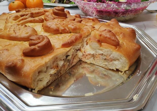 Это король нашего стола, блюдо, которое вызвало самое большое удивление. С виду пирог показался обыкновенным, похожие делают в школьных и студенческих столовых. В них еще такое скучное сухое тесто, знаете. Но здесь было не то, здесь была свежатина! Изумительная воздушная и пышная выпечка! Насчет начинки мнения разошлись: двум дегустаторам рыба показалась очень соленой. Однако эти отзывы быстро утонули в восторгах от теста. Оно покорило всех.