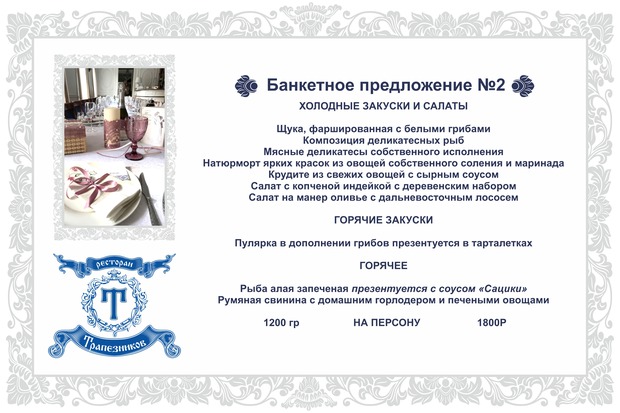 В «Трапезникове» уютно, красиво, вкусно и приятно — именно поэтому здесь расслабляются даже самые придирчивые и взыскательные гости. И именно поэтому сюда можно без проблем привести любых гостей, даже маму.