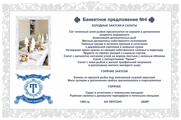 3. Опыт. Ресторан существует уже 5 лет. И это только в качестве «Трапезникова», а если считать все ребрендинги, заведение работает с 1987-го! Сколько здесь было банкетов — уже и сосчитать сложно. Персонал быстро сориентируется и поможет вам организовать идеальный, подходящий для вашей компании вечер. Ведь здесь работают профессионалы.