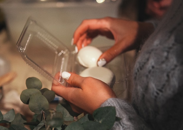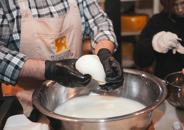 Обед.IRK.ru, вооружившись перчатками, отправился во вторую группу. Приготовление моцареллы состоит из нескольких этапов. Сначала тёплое молоко створаживают, добавляя в него сычужный фермент (так начинают готовить все сыры). Далее свернувшиеся сгустки заливают горячей подсоленной водой или сывороткой. Получившуюся массу аккуратно перемешивают и собирают в однородный шар. Отрывали от него по кусочку и, не торопясь, перекатывали из одной руки в другую, вытягивая эластичные сырные нити. После — снова фjрмировали шар и отправляли моцареллу в рассол.
