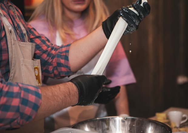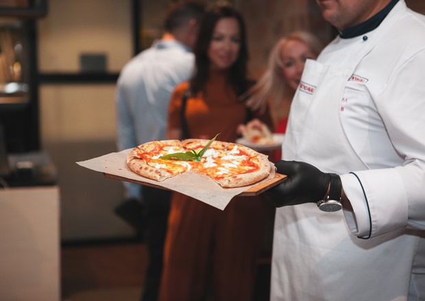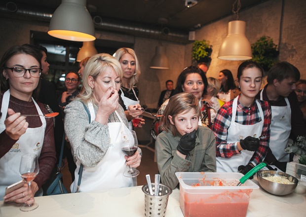 Гости мероприятия разделились на группы. Кто-то учился правильно работать с тестом для классической пиццы под руководством опытного пиццайоло Кирилла. А кто-то вместе с создателями «Сыра в масле» Ильей и Алексеем готовил моцареллу.