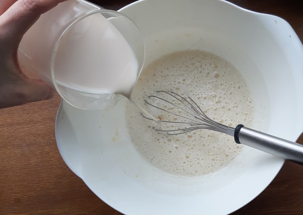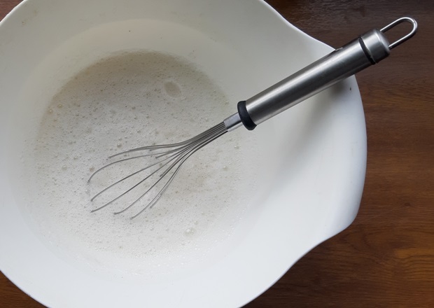 Отделяем желтки от белков. В глубокой миске взбиваем белки, добавляем сахар, желтки и ваниль. Ванилин в пакетиках – крайняя мера. Берите натуральную ваниль в стручках или сахар с натуральной ванилью. Не забудьте включить его в сахарные 100 граммов, не превышайте дозу. Добавляем молоко и сливки.