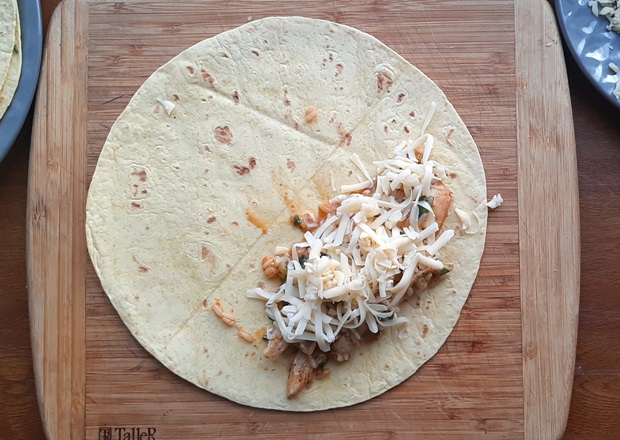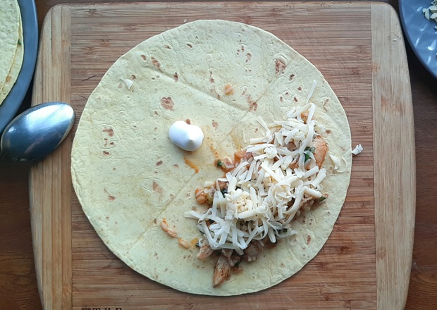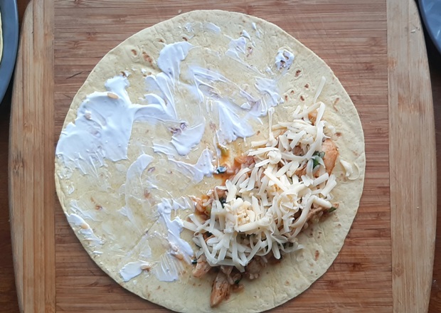 Трем на крупной терке сыр, который хорошо плавится. Отлично подойдет чеддер, гауда. У меня был мааздам, получилось вкусно. Начинаем собирать буррито. На край тортильи кладем начинку из сковороды, 2-3 столовых ложки. Заворачиваем с ближнего края и боков. Закручиваем. На втором буррито Россия победила Мексику – я решила, что столовая ложка майонеза – это прекрасно. И смазала ей лепешку. Если хотите — присоединяйтесь.