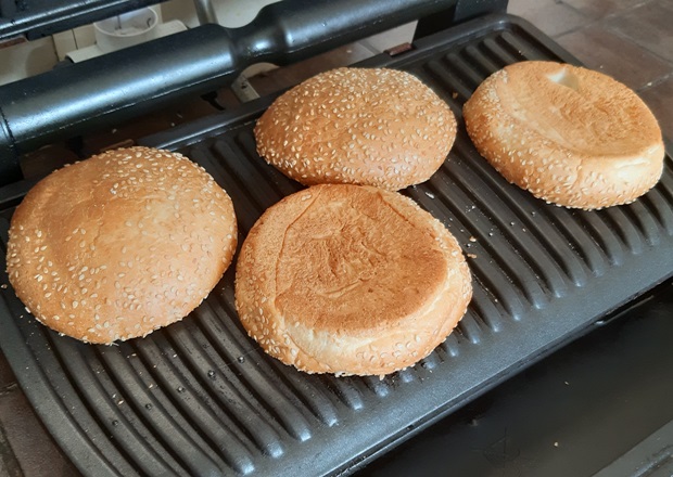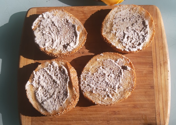 Разрезаем вдоль. Обжариваем пару минут. Так булка не намокнет от соуса и мясного сока. Перемешиваем майонез с горчицей. Про нее хочу сказать – в рецепте указано примерное количество, можно взять больше. С обычной будет острее, с зернистой – вкус мягче. Полученным соусом смазываем булки с внутренней стороны.