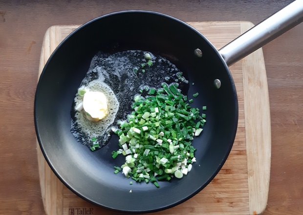 Режем лук и чеснок. Обжариваем пару минут на сливочном масле.