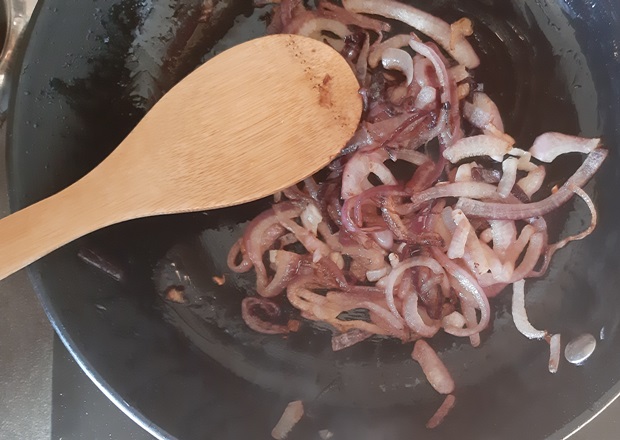 Готовим начинку. Лук режем полукольцами. Обжариваем на сливочном масле до золотистого цвета. Корнишоны режем тонко и по диагонали.