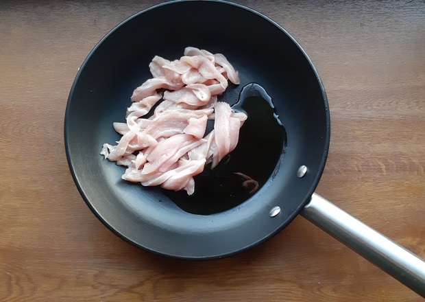 Курицу режем тонкими полосками. Обжариваем до готовности на любом растительном масле.