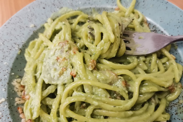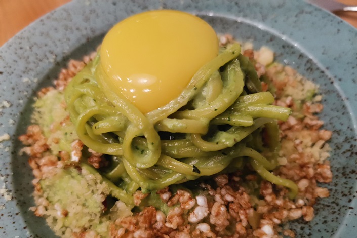 Паста зеленого цвета – это, конечно, не привычно. Скорее поверишь, что перед тобой тушеные овощи, чем макароны. Когда блюдо появилось на столе, в голове были разные сомнения: «неужели это вкусно?», «как это правильно есть?». Сверху карбонару украсили сырым желтком и гречневыми хлопьями. Перемешав ингредиенты так, что паста стала выглядеть как обычно, я, наконец, ее попробовала.