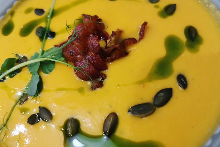Дегустатор №3. Суп-пюре из тыквы с чипсами из бекона (215 рублей) и зеленая Карбонара (355 рублей) в «Песто Тесто».