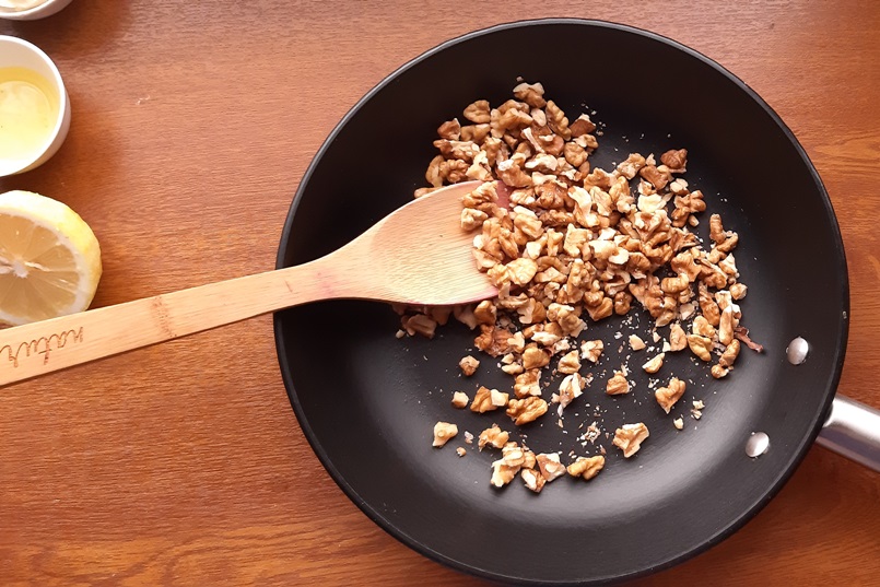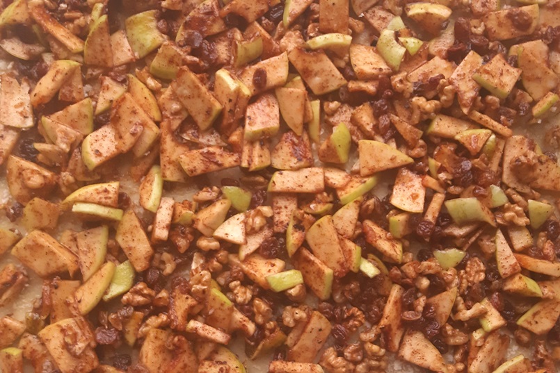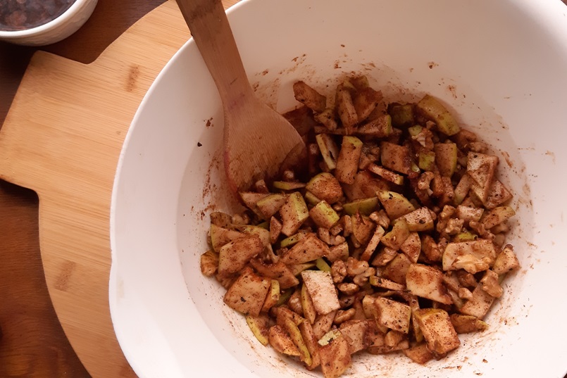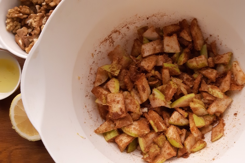 В глубокой емкости смешайте яблоки с сахаром и корицей. Сюда же – цедра. Хотите с кислинкой – добавьте сок половины лимона. Затем – грецкие орехи (можете обжарить, но это необязательно).