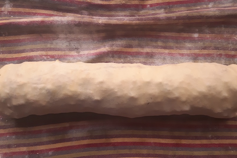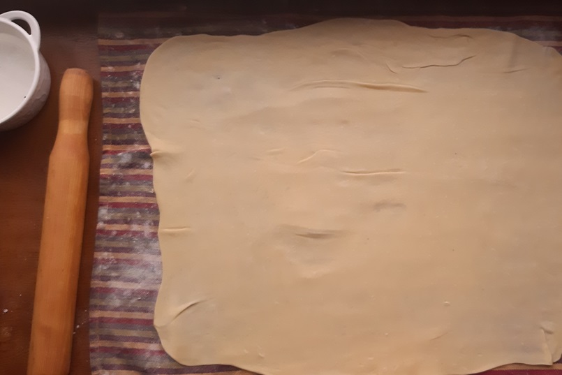 Я готовила пласт из теста на полотенце, можно это делать на силиконовом коврике. Рассказываю, как было дело у меня. Полотенце сбрызнула водой, присыпала мукой, раскатала скалкой тесто. Оно очень эластичное. Можно и немного растянуть руками до нужной формы.