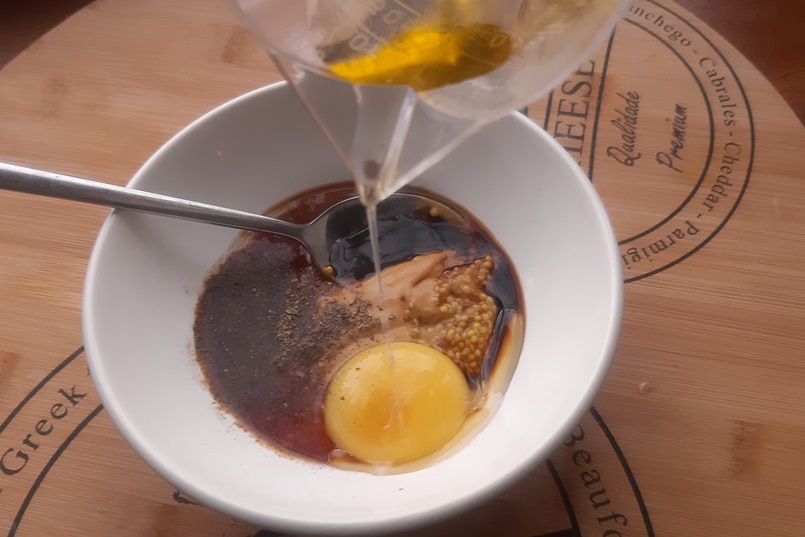 Возьмите пару ложек зернистой и обычной горчицы, 2-3 столовые ложки оливкового масла, желток, столовую ложку лимонного сока, по столовой ложке соевого соуса и меда, черный молотый перец. Смешайте все, кроме масла, вилкой. Затем взбивайте блендером, постепенно добавляя оливковое масло. Готово.