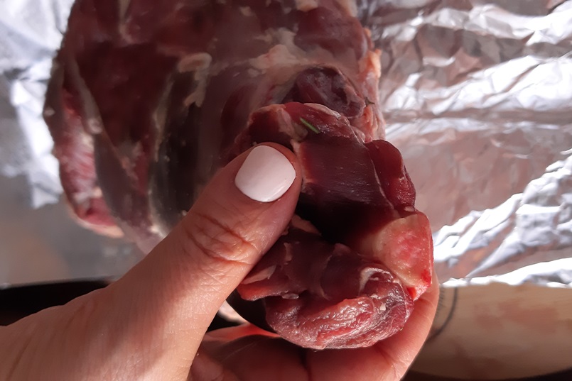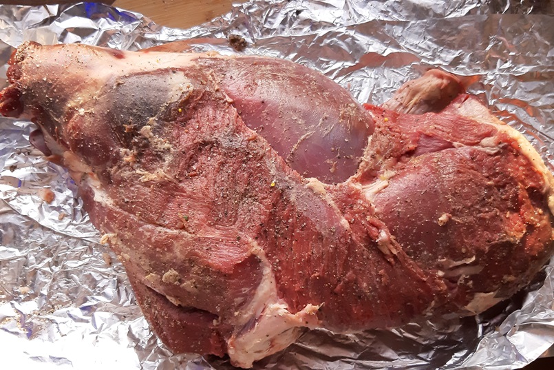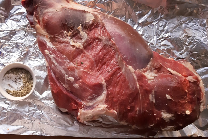 Смешиваем соль с перцем, натираем мясо. Часто хозяйки делают надрезы и шпигуют чесноком/морковью/анчоусами. Предлагаю другой вариант. Вдоль кости внутри ножом сделать углубление и добавить туда пару столовых ложек маринада. Он достаточно густой, вытечь не получится. Если что-то пошло не так, и маринад оказался жидким – можно заколоть парой зубочисток или перевязать кулинарной нитью. Теперь обмазываем смесью мясо со всех сторон.